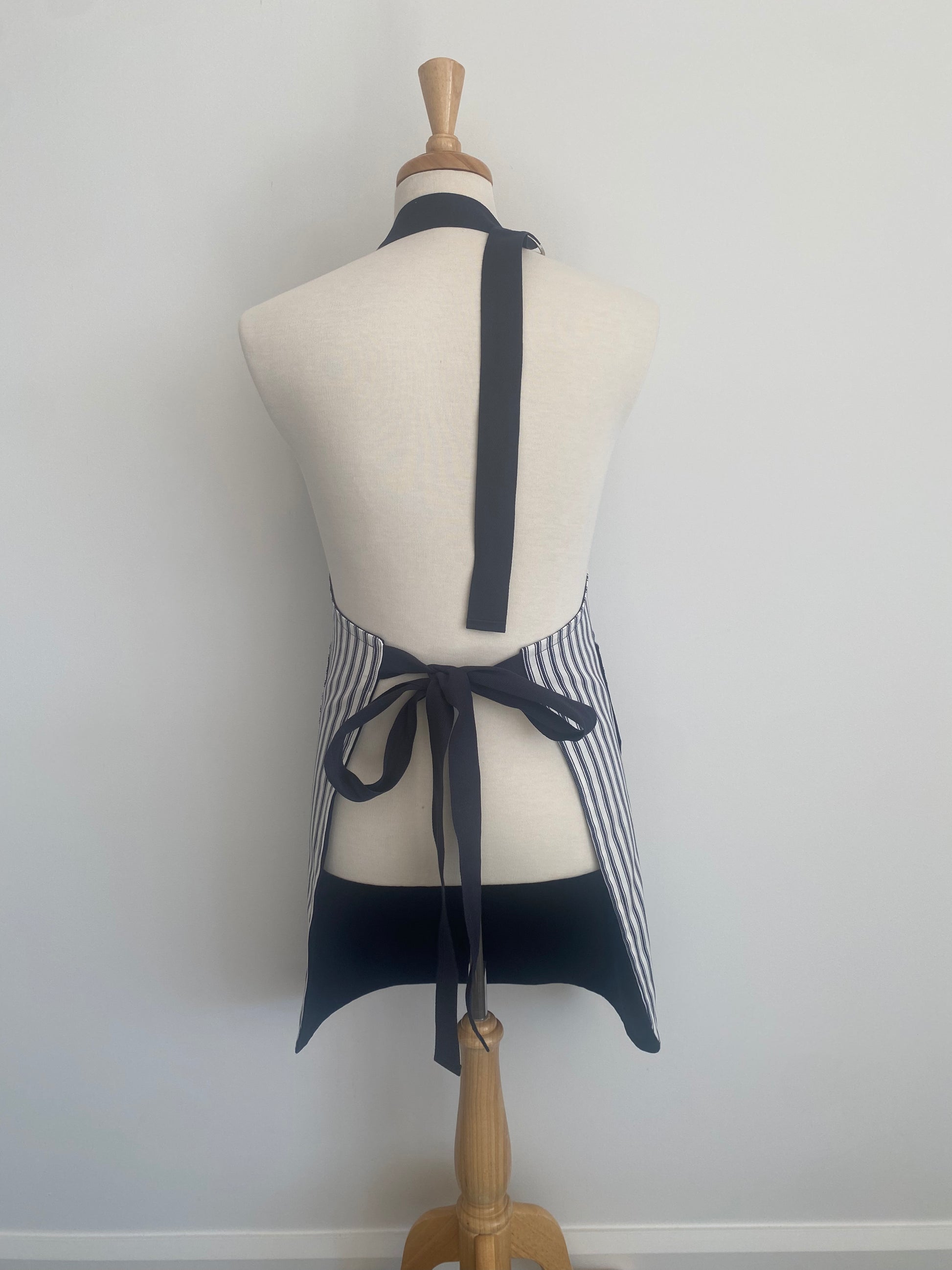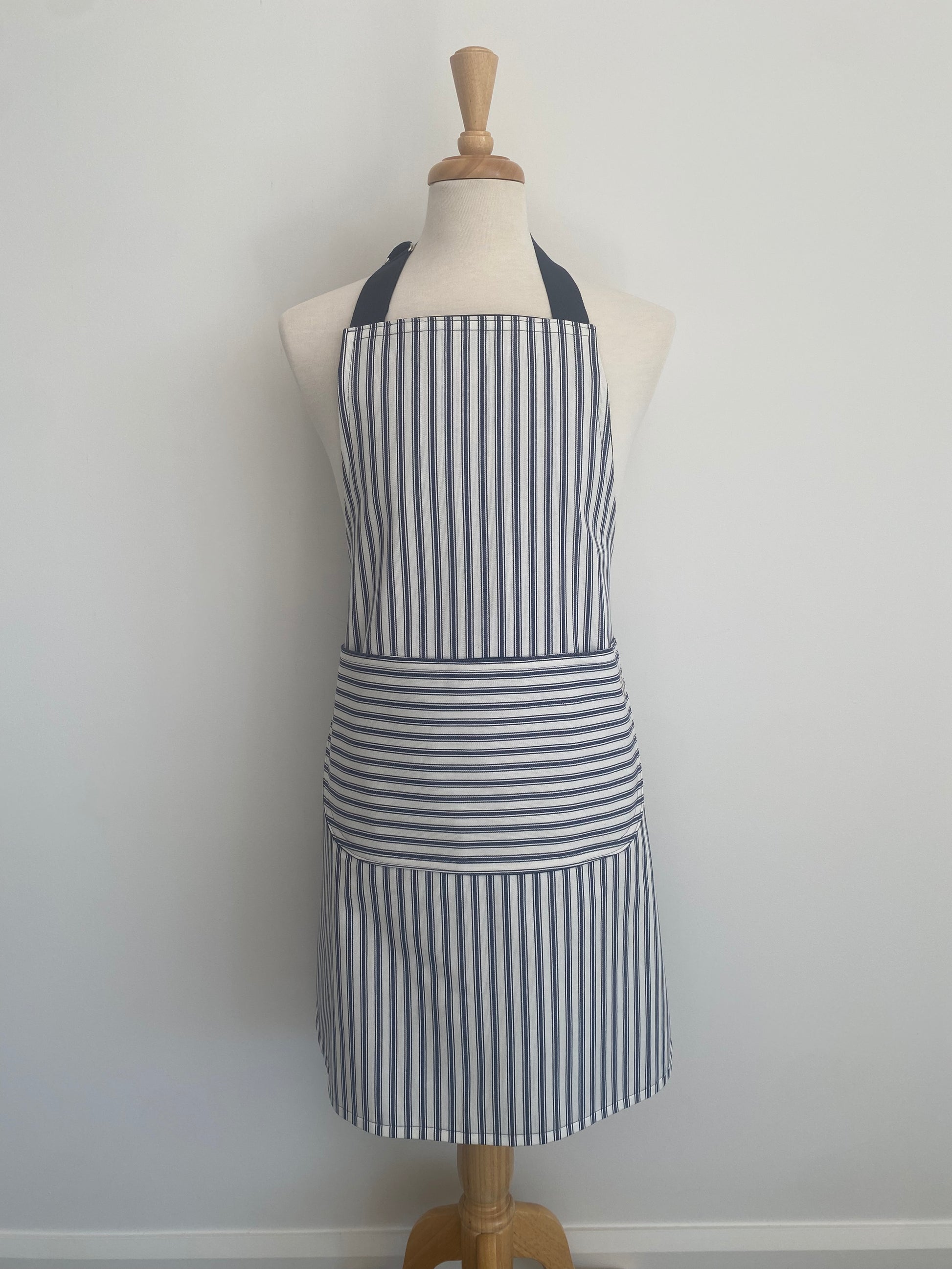 With an adjustable neck strap and waist ties, this apron offers a secure and comfortable fit for all body types. The navy ticking stripe design adds a timeless touch, making it an excellent choice for backyard barbecues, summer cookouts, or even kitchen use. Cook with confidence and style in this must-have BBQ apron!