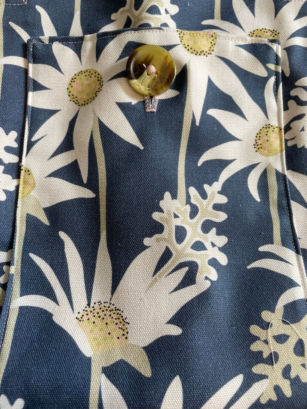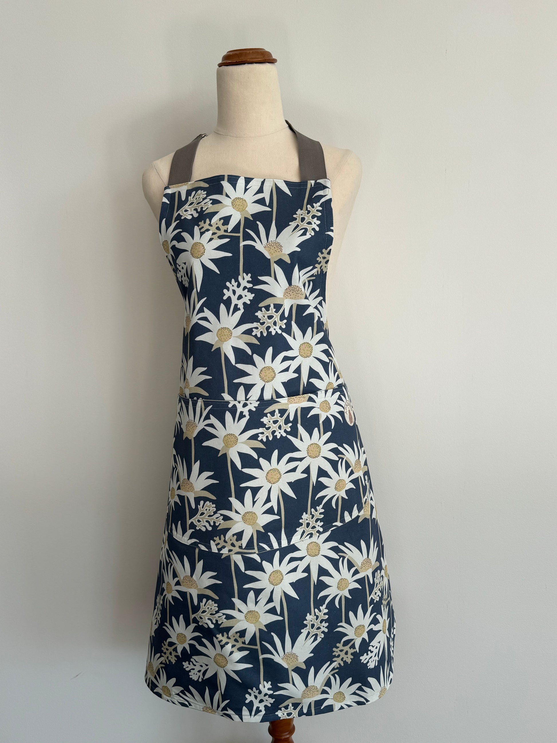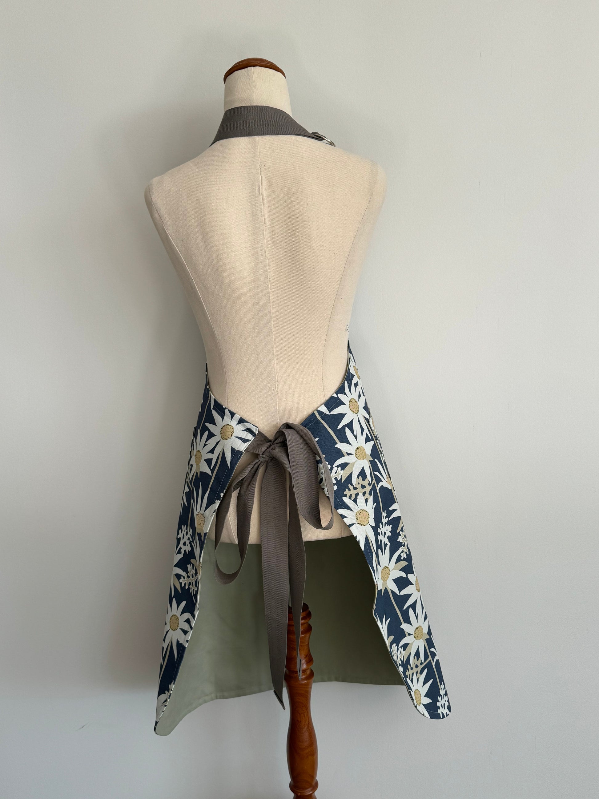 This beautifully crafted apron is the perfect accessory for anyone who loves to cook or garden with a touch of style. Handmade with attention to detail, it features a charming flannel flower design on a rich blue background, made from quality fabric that is both hard-wearing and lined for extra protection.