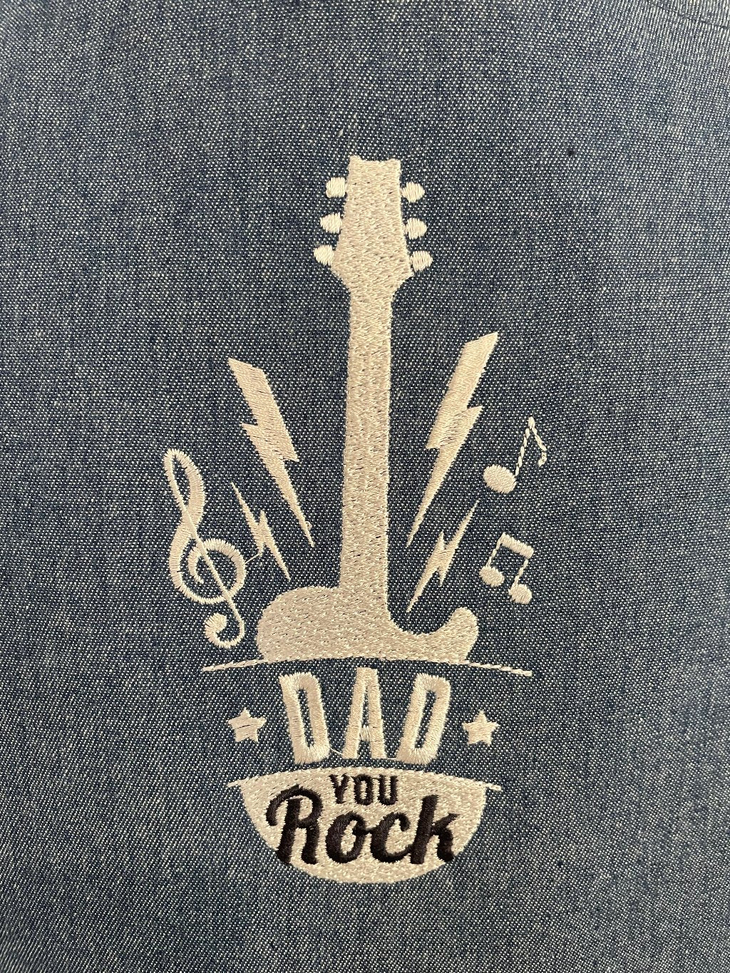 tep up your grilling game and show appreciation for the ultimate grillmaster with our 'Dad You Rock' Embroidered BBQ Apron. Meticulously designed for the dad who is as comfortable flipping burgers as he is strumming a guitar, this apron combines top-notch durability with a hefty dose of cool. The premium fabric is chosen for its ability to withstand the rigorous demands of barbecuing, promising longevity and resilience.