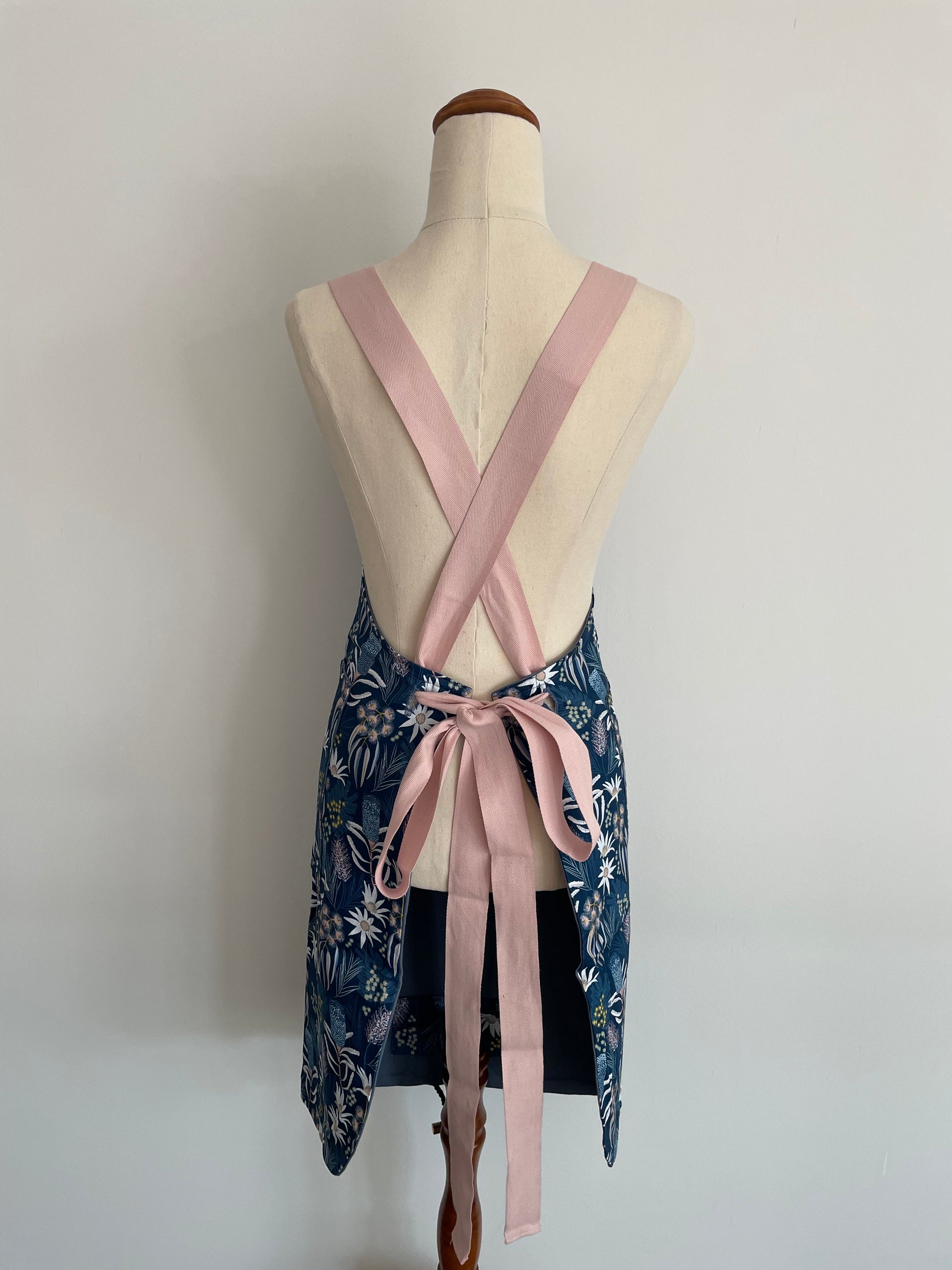 Presenting the Banksia Flannel Flower Pouch Harvest Apron, a garment that seamlessly combines distinctive style with practicality for those who love to garden, cook, or engage in any hands-on activity. This apron features a lush illustration of banksia and flannel flowers, set against a deep navy canvas, complemented by soft pink straps that add a touch of warmth.