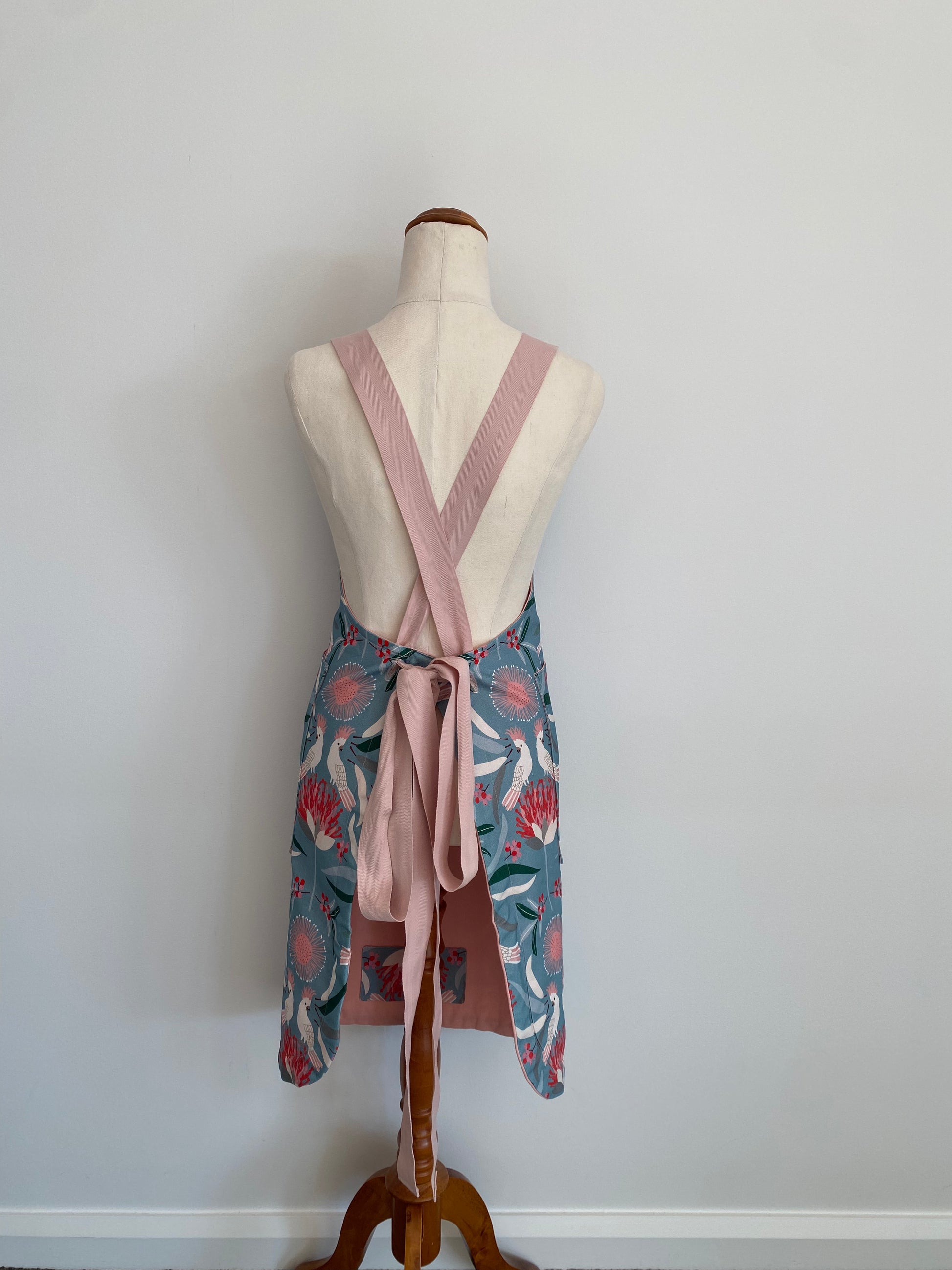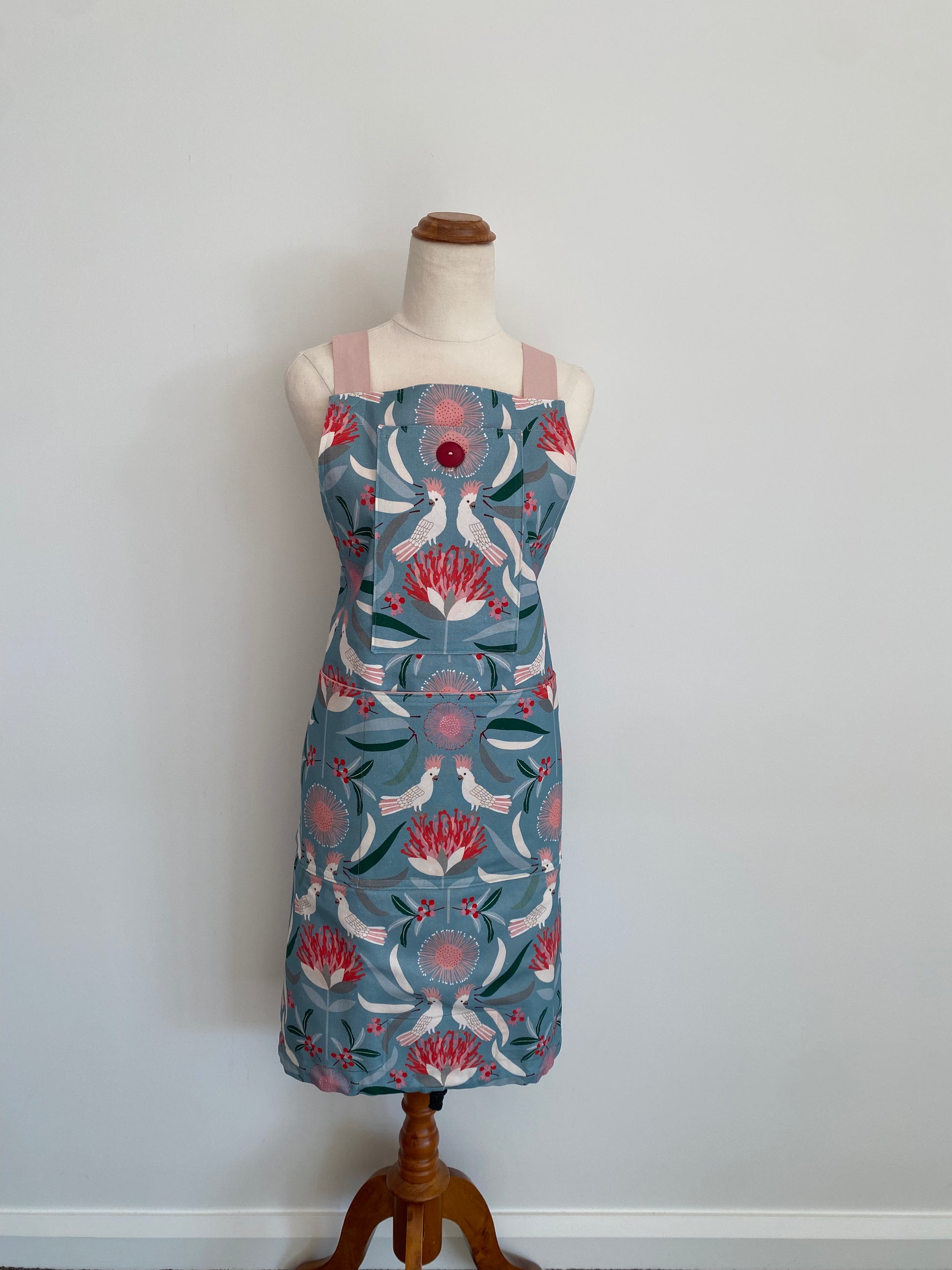 Introducing our elegant White Cockatoo Harvest Apron! This beautifully designed apron features a stunning pattern of white cockatoos perched amidst vibrant floral blooms and lush greenery, set against a sophisticated blue background. The intricate design and harmonious colour palette make this apron a stylish addition to any kitchen or workspace.