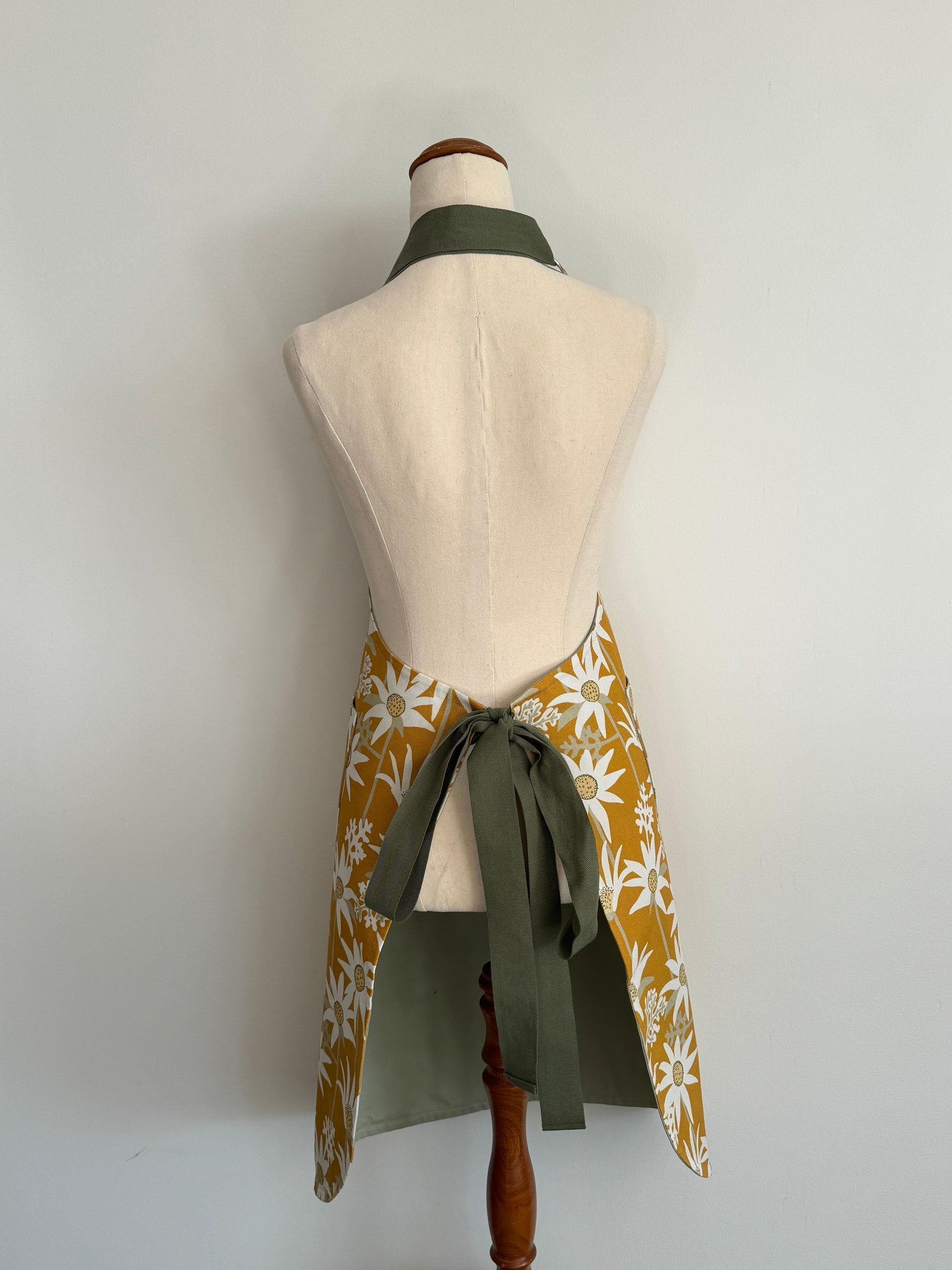 This exquisite apron boasts an enchanting pattern of flannel flowers on a rich mustard background, bringing a touch of nature's charm to any culinary setting. Crafted with care, each apron is lined for enhanced durability and comfort during extended wear. The design features an adjustable neck strap, ensuring a perfect fit for any chef, and a spacious waist pocket to keep your essential tools within easy reach. The robust fabric selection promises longevity, even through frequent use in the kitchen, at the barbecue, or while tending to the harvest.