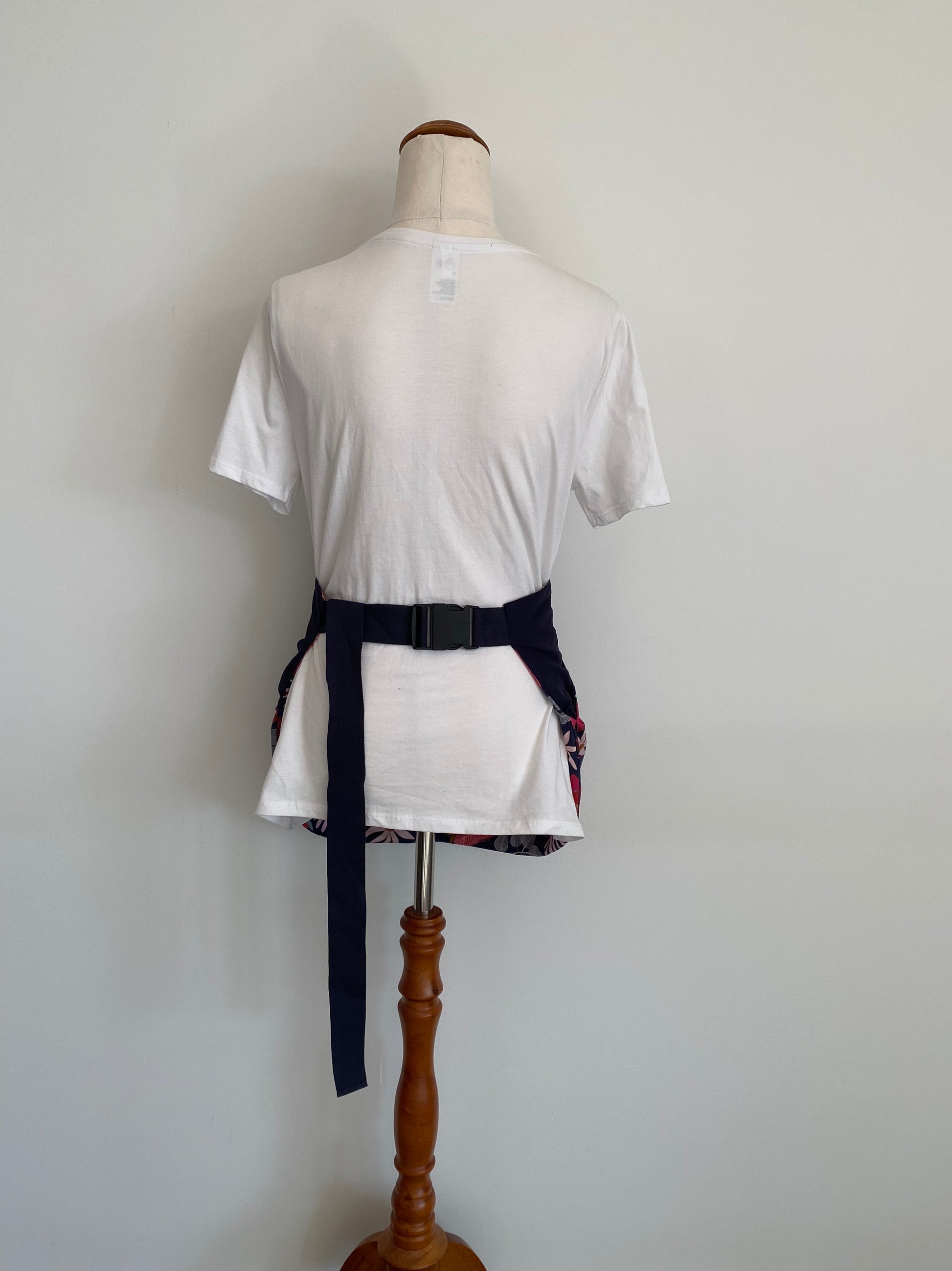 Introducing our stunning Navy Natives Peg Apron, a perfect blend of functionality and style for your kitchen or crafting needs. This apron features a striking navy background adorned with a vibrant, whimsical floral print in shades of pink, red, and white. The design is both playful and elegant, making it an eye-catching addition to any wardrobe.