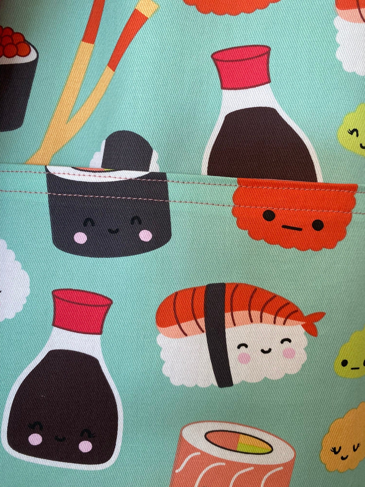 Introducing our adorable Sushi Kids Apron! Perfect for young food enthusiasts and budding chefs, this apron features a delightful sushi-themed pattern that is both fun and engaging. The light blue background is adorned with cute and colourful sushi characters, soy sauce bottles, and chopsticks, making it an eye-catching and playful addition to any kitchen or art station.