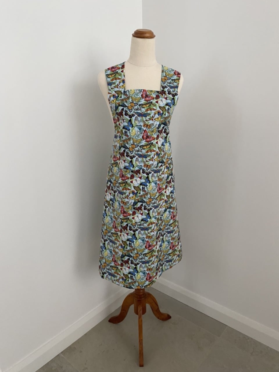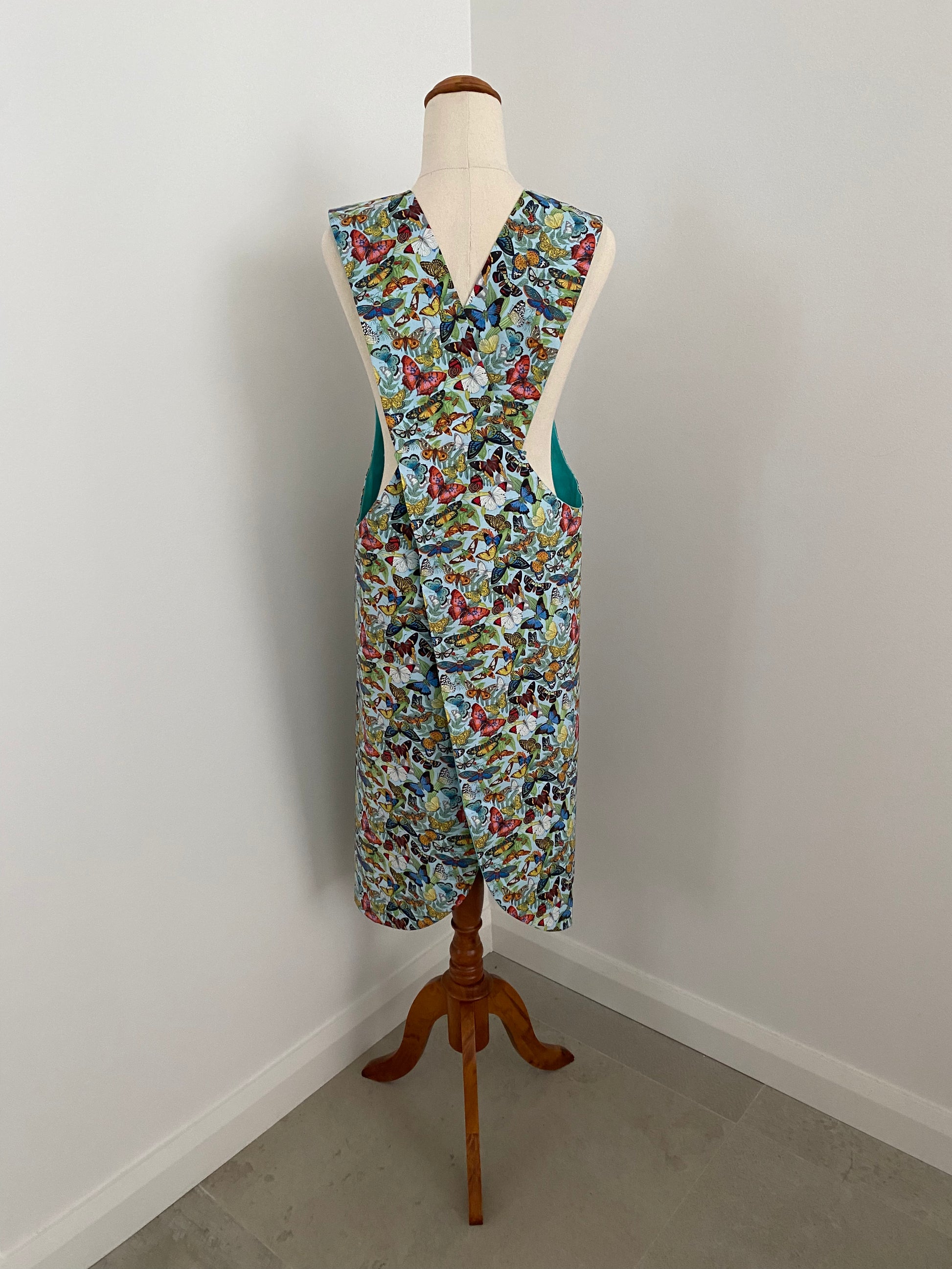 Please be aware that the lining of each apron may differ, as it is contingent on the availability of fabric stock. This ensures that while the outer butterfly pattern remains a consistent and charming feature, your apron may carry a unique lining, making it as individual as you are. Whether you're a culinary enthusiast or a crafting maestro, this Butterfly wrap-around apron is designed to cater to your needs with elegance and ease.