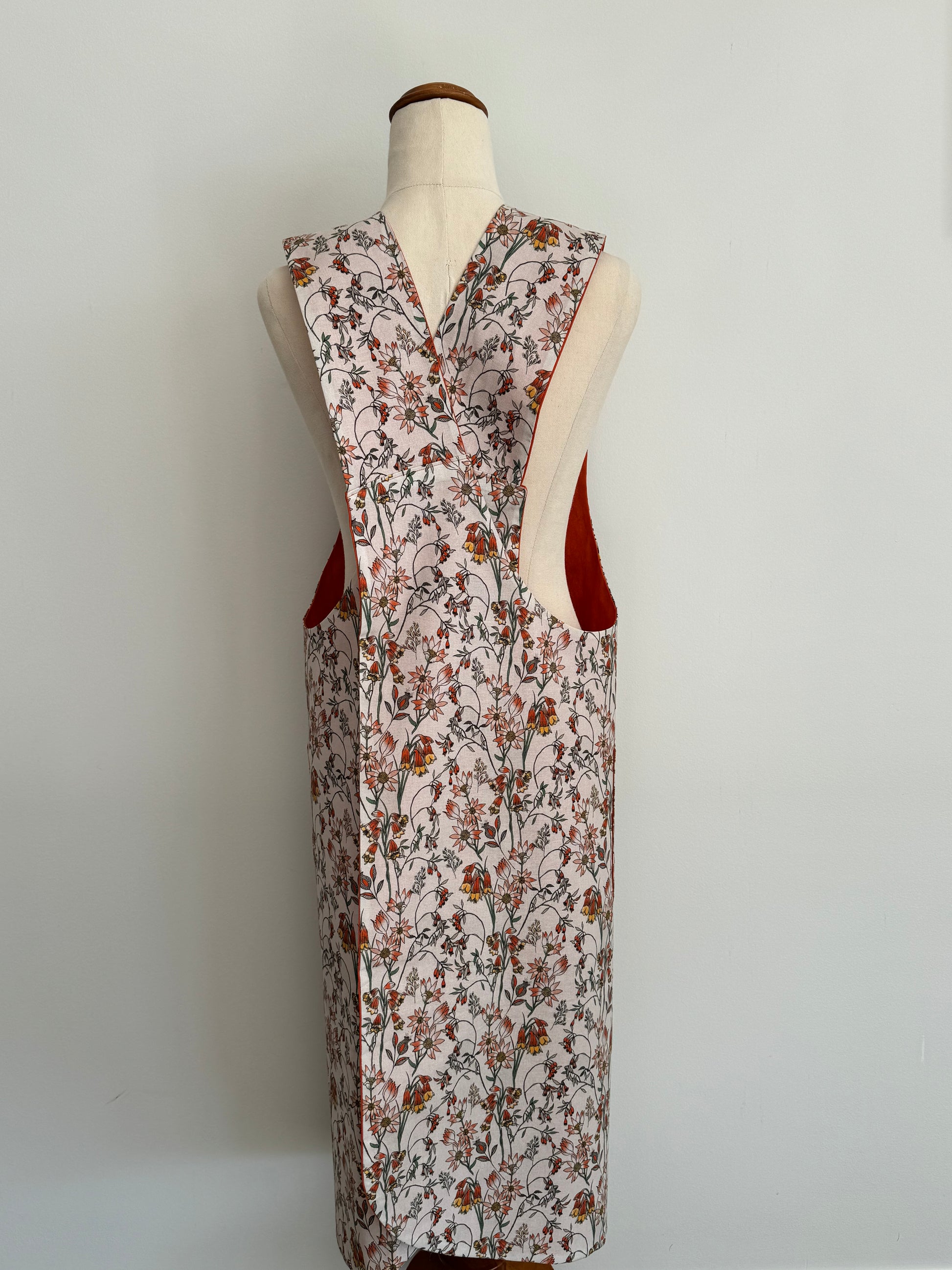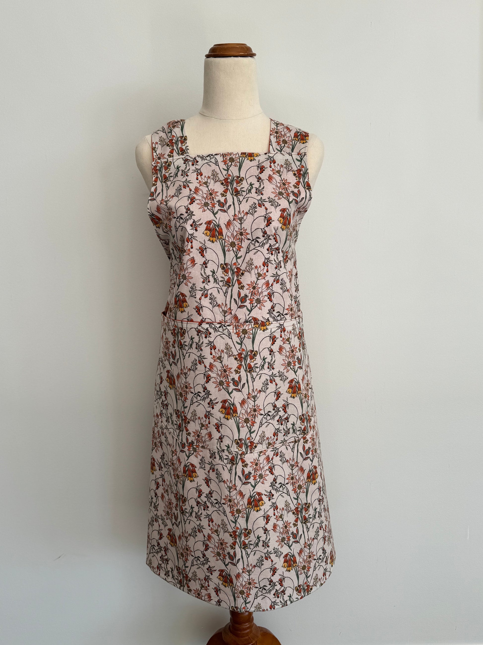 Introduce a touch of floral elegance to your daily tasks with this Aproned wrap-around apron, adorned with the delicate Orange Bellflower Fabric. This apron is a testament to ease and style, crafted to simply slip over your shoulders and criss-cross at the back, eliminating any need for fiddly straps or ties.