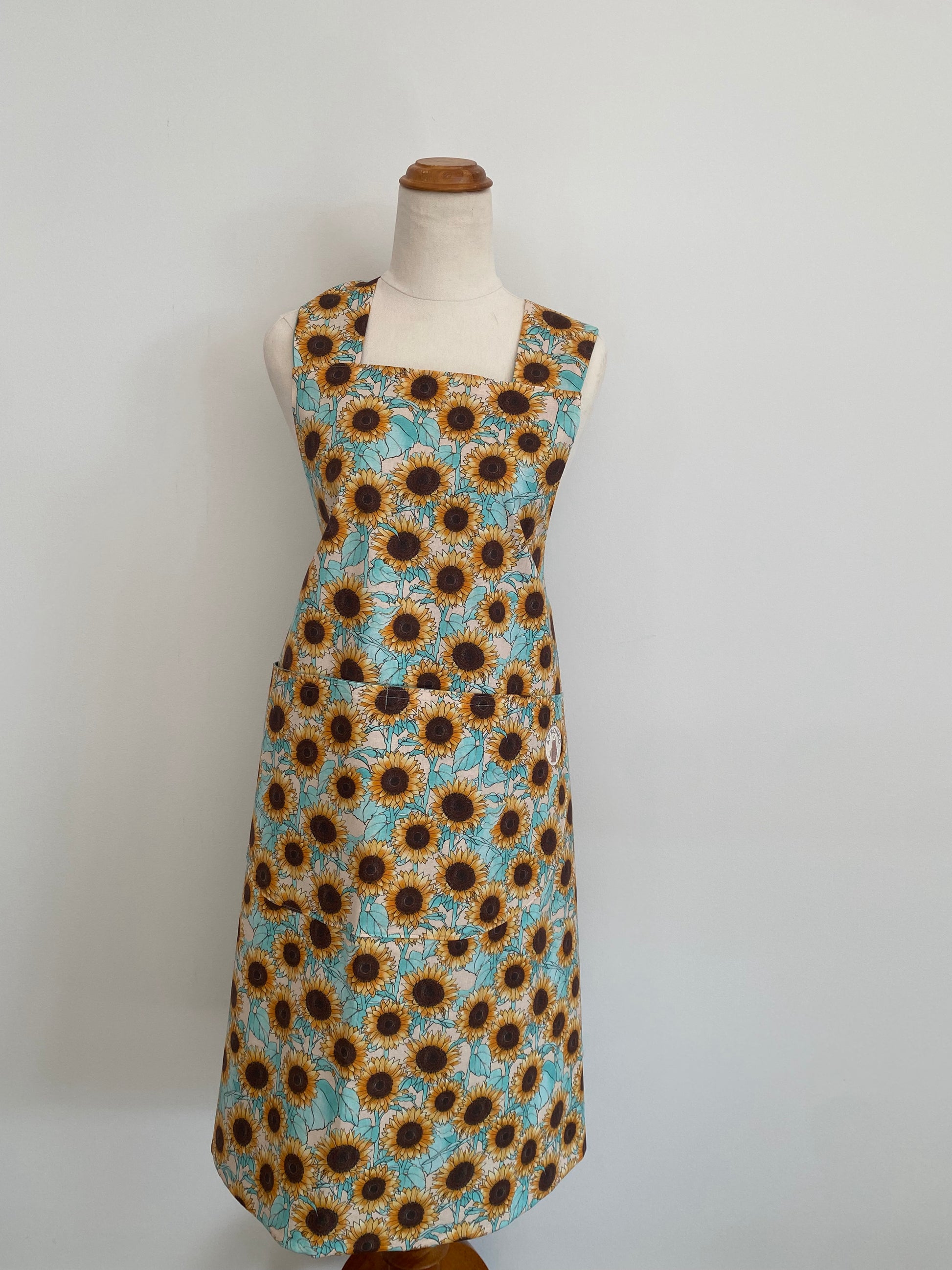 Introducing our charming Sunflower Wrap-Around Apron! Designed to bring a touch of sunshine to your kitchen or craft space, this apron features a delightful sunflower pattern set against a soothing blue background. The vibrant sunflowers are sure to brighten up your day and inspire a sense of warmth and happiness.